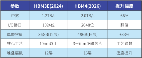 而HBM4則是HBM3e的“繼任者”,預計將在2026年大規模量產應用,其設計目標直指“帶寬翻倍、容量倍增、能效再優化”,以滿足萬億參數AI模型需求。
